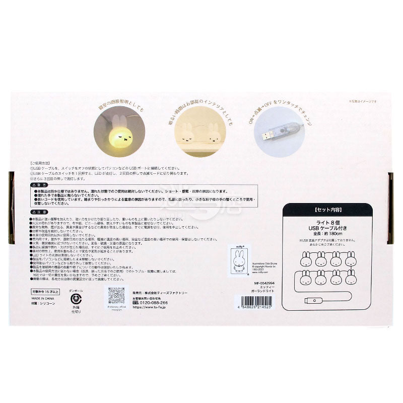 内容量: 矽膠燈泡8個連USB線; 尺寸: 燈泡約 60x45x37mm,燈串全長約 180cm; 適用年齡: 15歲以上; 燈泡造型是可愛的miffy面孔,一共有2款 (各4個燈泡) ,開關簡易方便,一觸即可!適合用作房間的間接照明以及裝飾,溫暖柔和的燈光可以為室內空間營造幸福的氛圍!