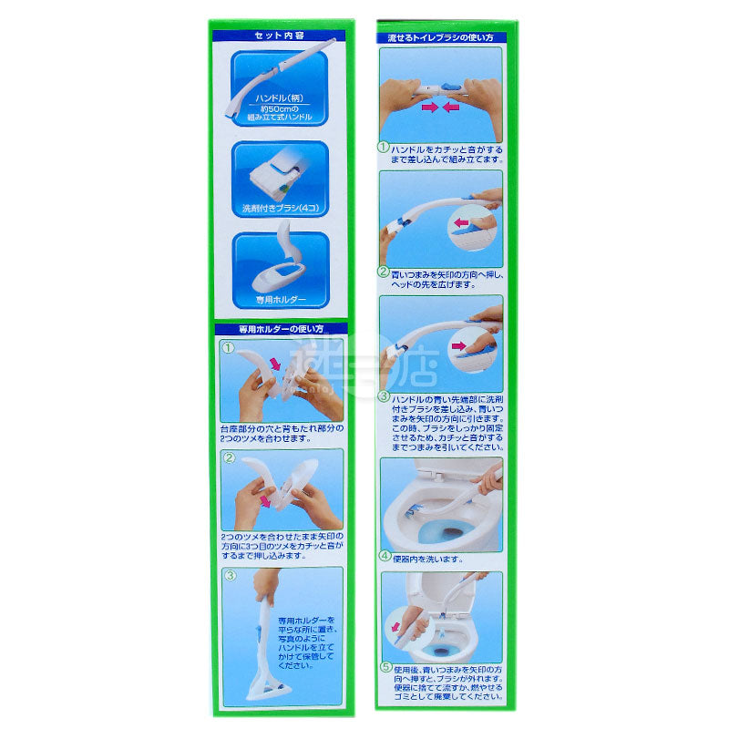 内容量: 手柄1個、附帶清潔劑的清潔刷頭4個、專用支架1個; 附帶濃縮清潔劑的即棄式馬桶刷,刷頭採用像衛生紙一樣可分解的材料,可以在不弄髒雙手的情況下清潔馬桶,清洗後一觸即可丟進馬桶沖走,非常輕鬆方便!