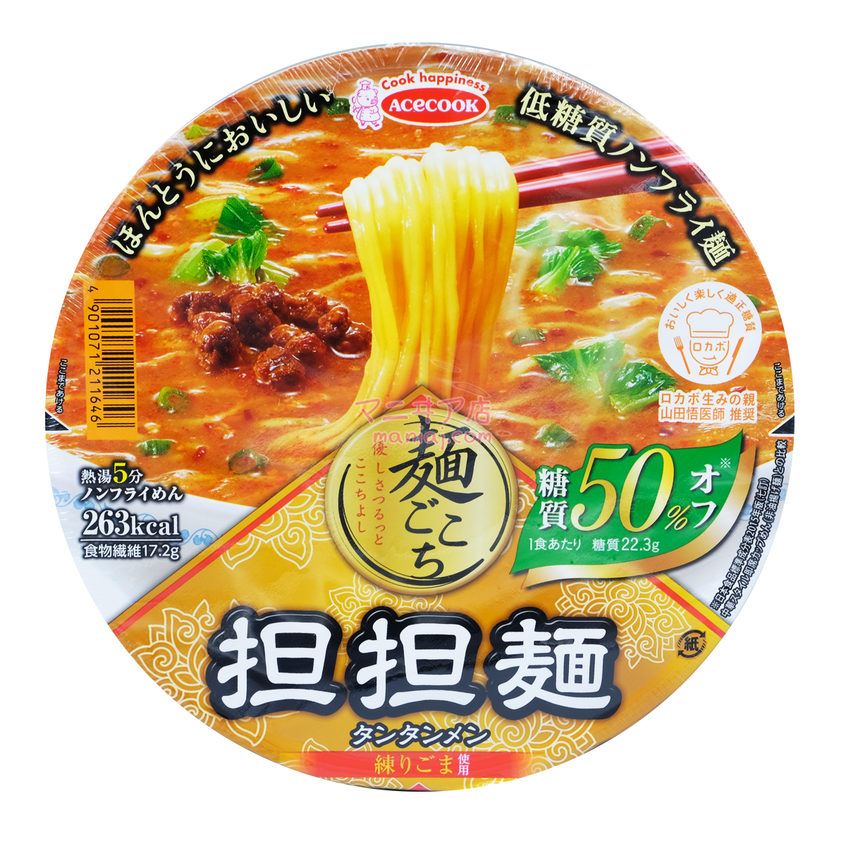"保持麵質的美味,是滑溜的低糖質麵。充滿中華麵風味,味噌和豬肉配上豆板醬和甜麵醬,再加入香味蔬菜製成擔擔湯底。碎芝麻更令人食慾大增。配料肉碎、小白菜、大蔥、辣椒和芝麻。