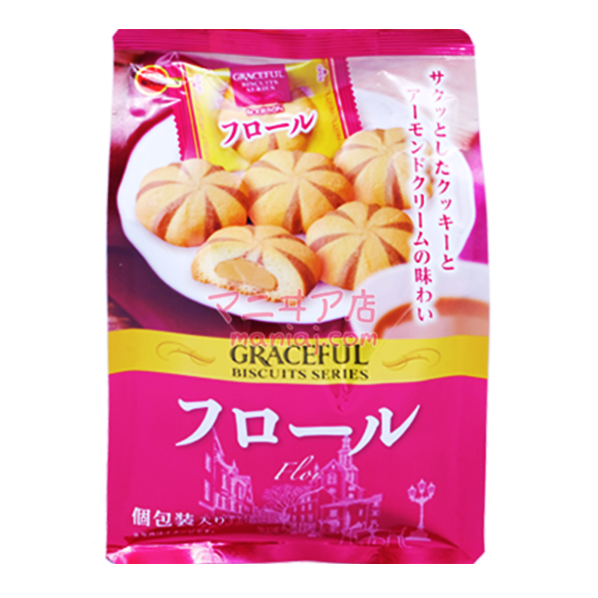 "脆脆的曲奇包著光滑的杏仁忌廉。請享受脆餅和忌廉的和諧食感。内容量:91g(獨立包裝)"