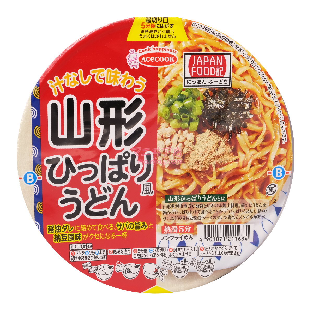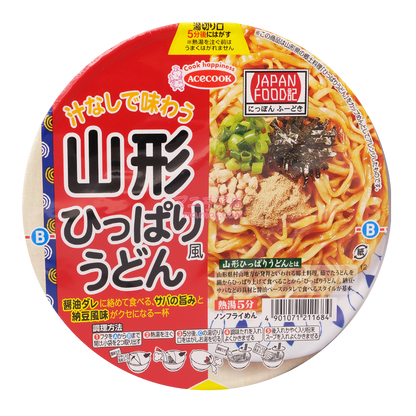 "麵粉裡加入大量的水份,製成可拉伸有彈性的滑溜烏冬。醬油裡加入鰹魚等魚乾高湯,粉末湯汁亦有鯖魚的鮮味,再配上納豆的風味,令人食慾大增。配料有納豆風味的大豆加工品、大蔥和燒紫菜。