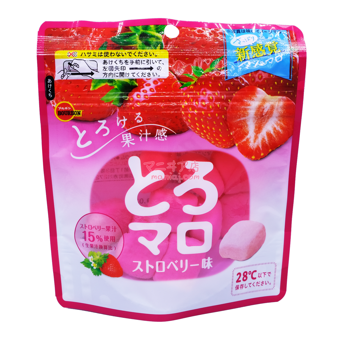 "軟綿綿就像綿花糖一樣,是新食感的士多啤梨味軟糖。内容量:40g"