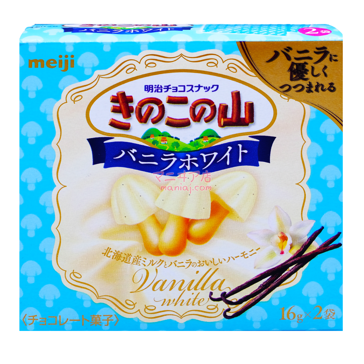 "使用了北海道產牛奶,混入了雲呢拿籽的白朱古力造成蘑菇形狀,和脆口的餅乾亦相當配合。内容量:16g X 2袋"