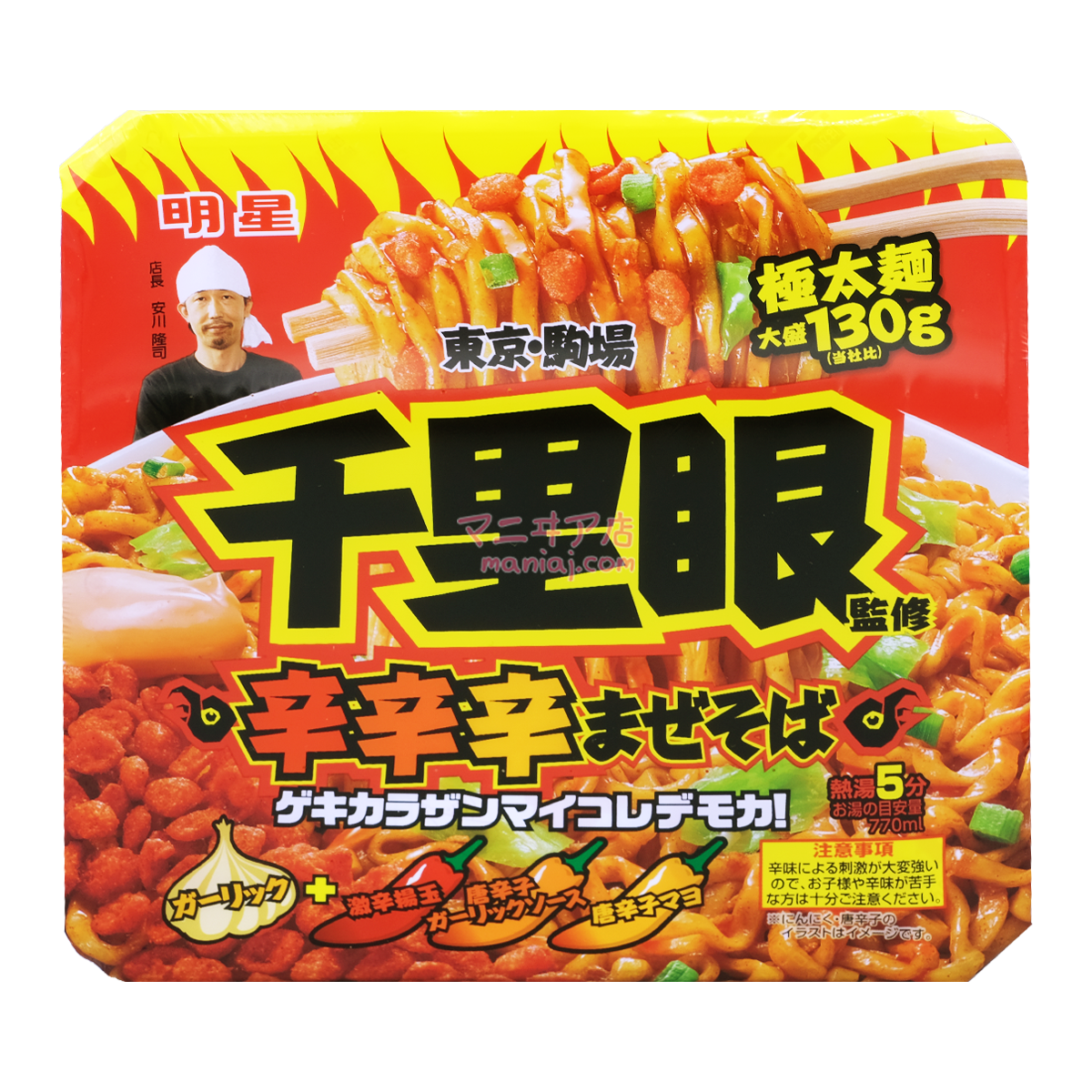 "以拉麵店千里眼名物「辛揚」為基礎,加入哈瓦那辣椒使辣味提昇,成為新開發的拉麵「激辛揚玉」。由食材、醬汁和蛋黃醬組成三種辣味,是為「辛辛辛」撈麵。