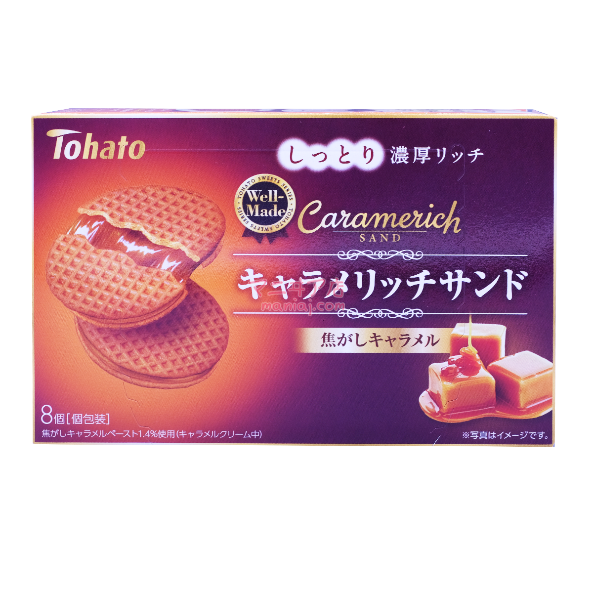 "以烤焦糖作為夾心,製成濃厚味道的夾心餅。焦糖的甜味和夾心餅十分配合,令人吃完回味。