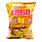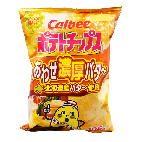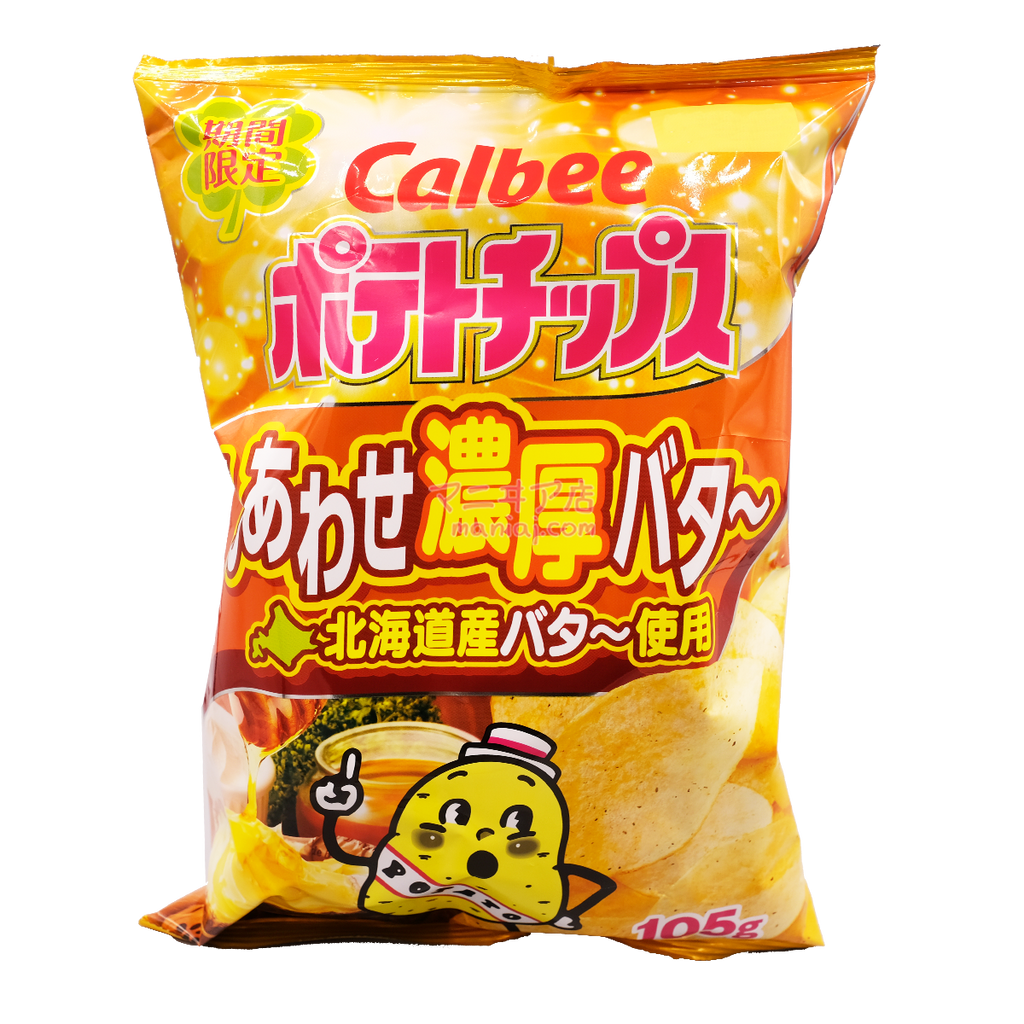 "以牛油、蜂蜜、香芹、馬斯卡彭芝士4種素材作基礎,加上使用的是北海道產牛油,薯片的牛油香味更為濃厚。期間限定商品。内容量:105g"