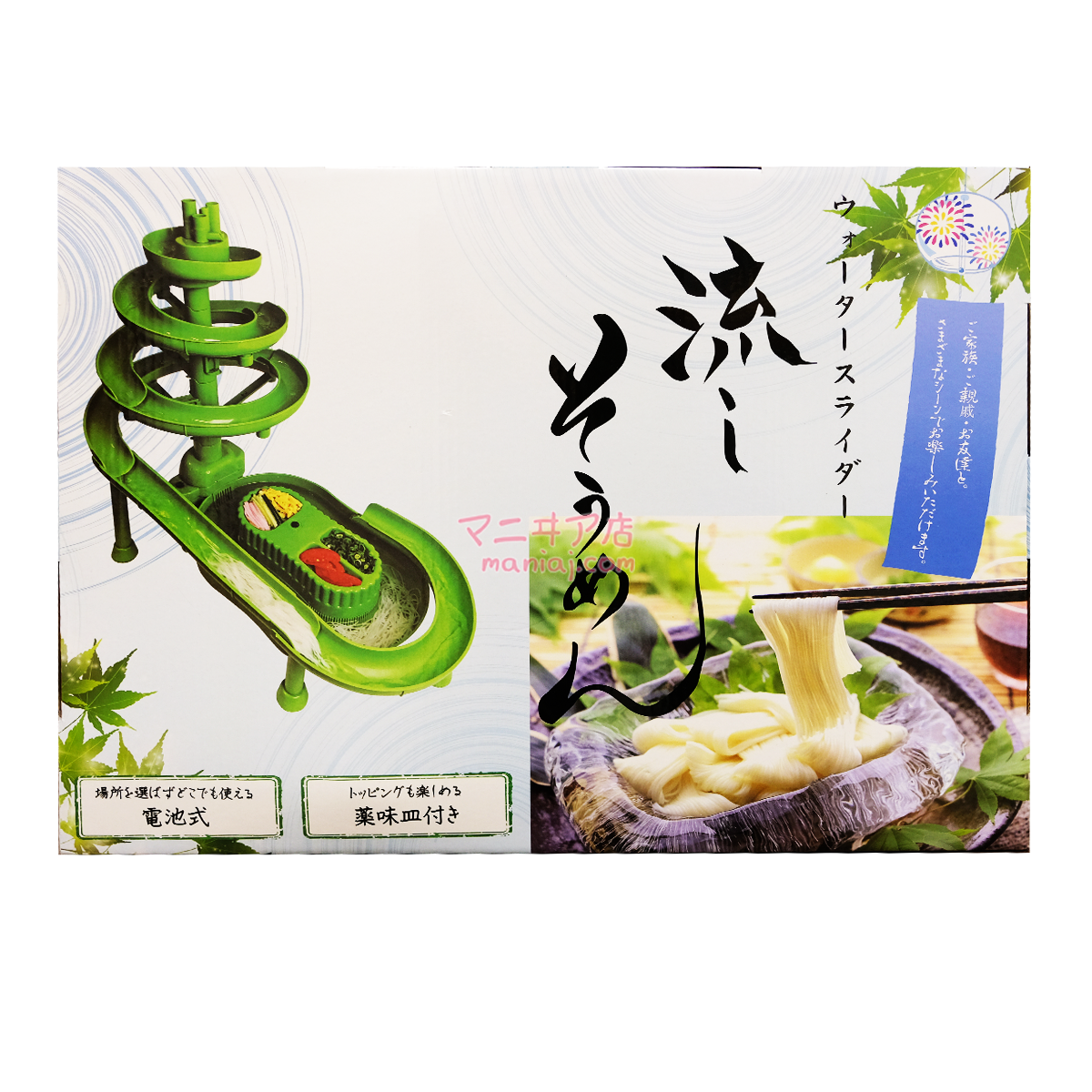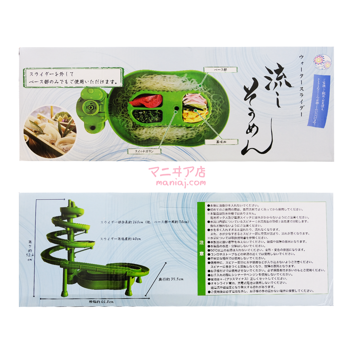 不論在何處都可使用的滑水道流水素麵機。無論是平時在飯桌上使用,還是開派對時使用都十分簡單,頂部滑水道部分可以與底部拆開,只用底部吃流水麵也別有一番風味。滑水道全展約260cm,高約40cm。水可循環再用,不需經常加水。