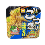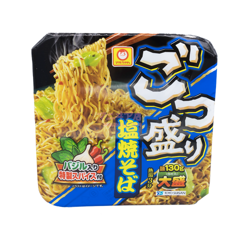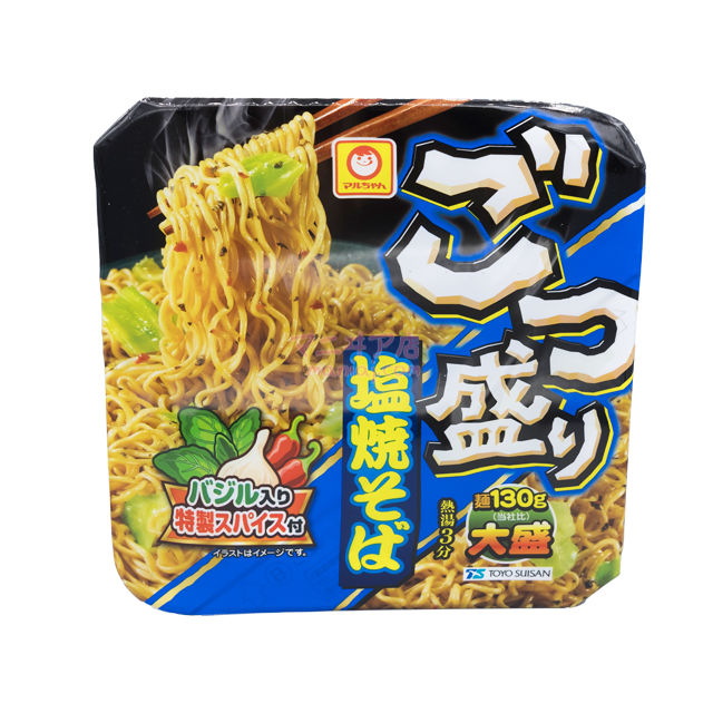 大盛鹽燒撈麵是「ごつ盛り」系列的期間限定品。鹽味加上其他香料。風味濃郁,圓角麵條更有彈性的。加入洋蔥味,橄欖油, 羅勒,大蒜,粗碎紅辣椒等香料,含有白菜。