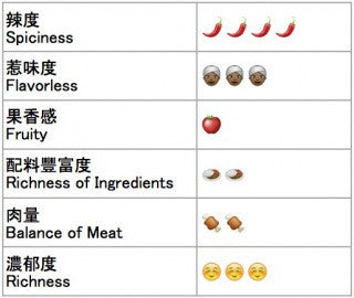 蔬菜(洋蔥、胡蘿蔔、)雞肉、面粉、食用油脂、蕃茄醬、蘋果醬、牛肉精華、雞肉精華、花椒、酸辣醬、辣醬油、咖喱粉、砂糖、蒜、姜、醬油、食鹽、黃油、酵母精華、小豆蔻、香菜、干燥土豆泥、豬肉精華、白蘭地、洋蔥粉、小茴香子、紅辣椒、焦糖色素(含有黃豆成分在內)