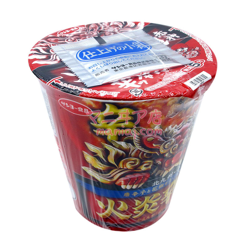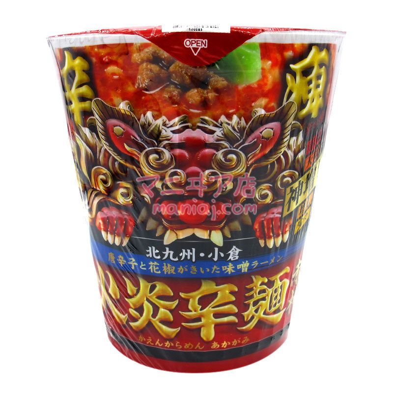 北九神的人氣拉麵店「火炎辛麵赤神」以杯麵形成再現!有口感的粗麵條,配上以赤味噌和白味噌作基礎,加入豬肉和雞肉的鮮味,再以大蒜、生薑、辣椒、花椒等製成麻辣味噌湯底。配料有椰菜、肉碎和辣椒。