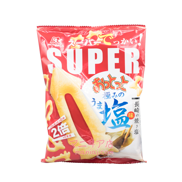 比平時大兩倍的超級魷魚<超正鹽味>. 能滿足成年人的份量, 超級大,超級好食. 用了長崎縣烤鹽,脫穎而出的北海道利尻海帶鹽。